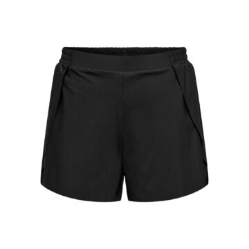 Specificaties: * Pasvorm: regular fit; ruime short met een strakke short daaronder; elastische tailleband met aantrekkoord * Temperatuurregeling: sneldrogende en vochtafdrijvende stof; mesh inzetstukken aan de zijkanten * Zakken: kleine zak met ritssluiting aan de zijkant * Kleur: zwart * Materiaal: 74% polyester – 14% polyamide – 12% elastaan * Extra bijzonderheden: reflecterende details