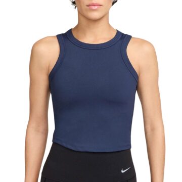Specificaties: * Pasvorm: aansluitende pasvorm; korter model; hoge halslijn; racerback * Temperatuurregeling: Dri-FIT technologie houdt je droog en comfortabel * Kleur: Navy * Materiaal: 80% polyester (waarvan minstens 75% gerecycled) – 20% elastaan * Extra bijzonderheden: het Nike logo aan de achterkant is reflecterend