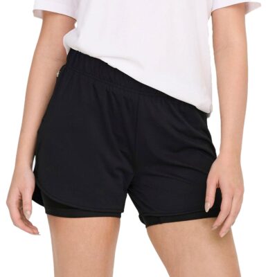 Specificaties: * Pasvorm: regular fit; ruime short met een strakke short daaronder; elastische tailleband met aantrekkoord * Temperatuurregeling: sneldrogende en vochtafdrijvende stof; mesh inzetstukken aan de zijkanten * Zakken: kleine zak met ritssluiting aan de zijkant * Kleur: zwart * Materiaal: 74% polyester – 14% polyamide – 12% elastaan * Extra bijzonderheden: reflecterende details